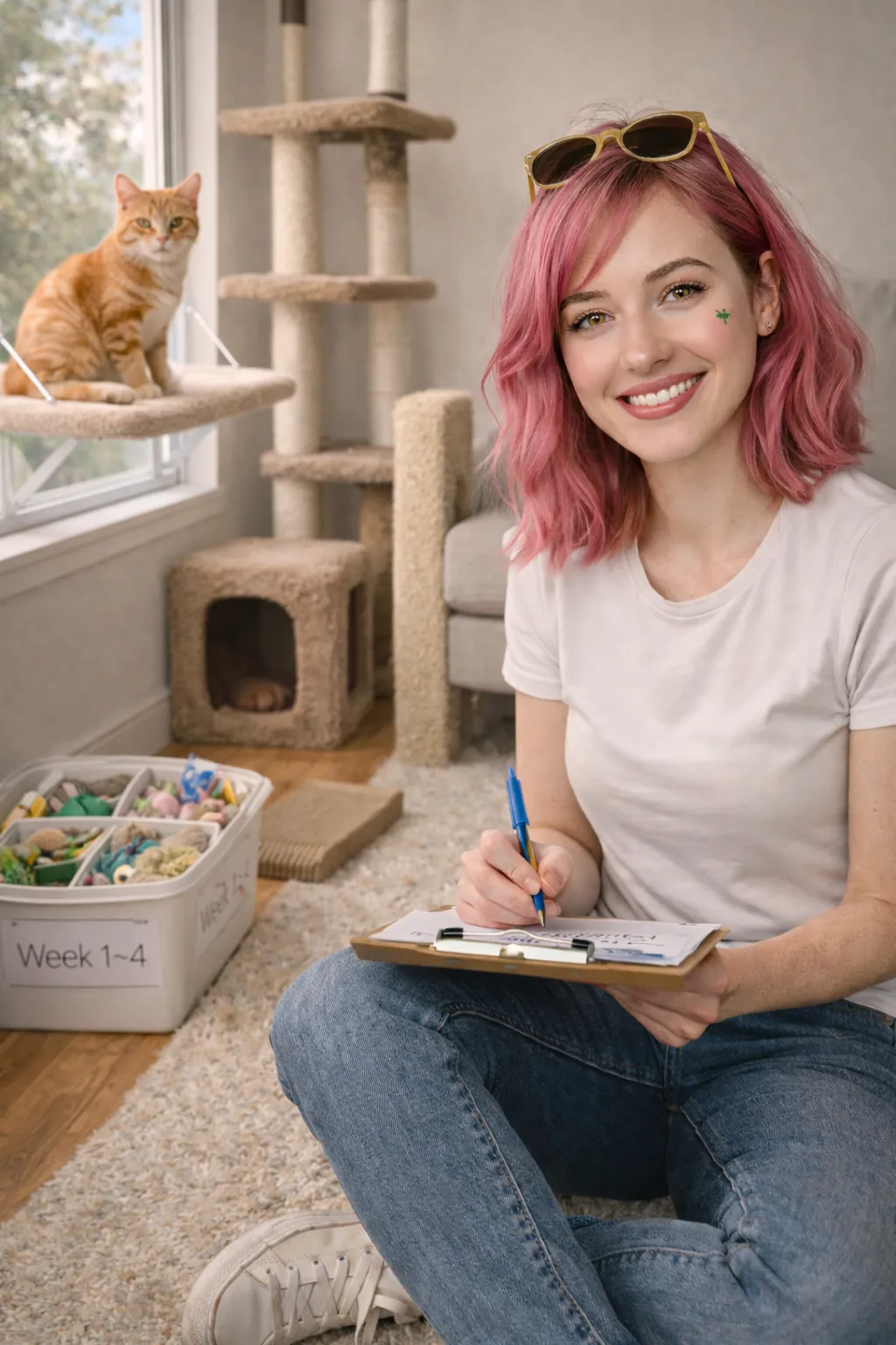 Many cats show changes within the first week once the vertical route and scratch zones are in place—especially when you add the 10-minute play → feed routine in the evening.