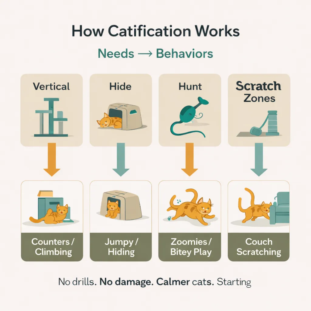 Yes. The system is designed for small spaces. You’ll use the “3-zone” layout (Vertical / Calm / Functional) and a simple 3–5 step cat highway that doesn’t require drilling.