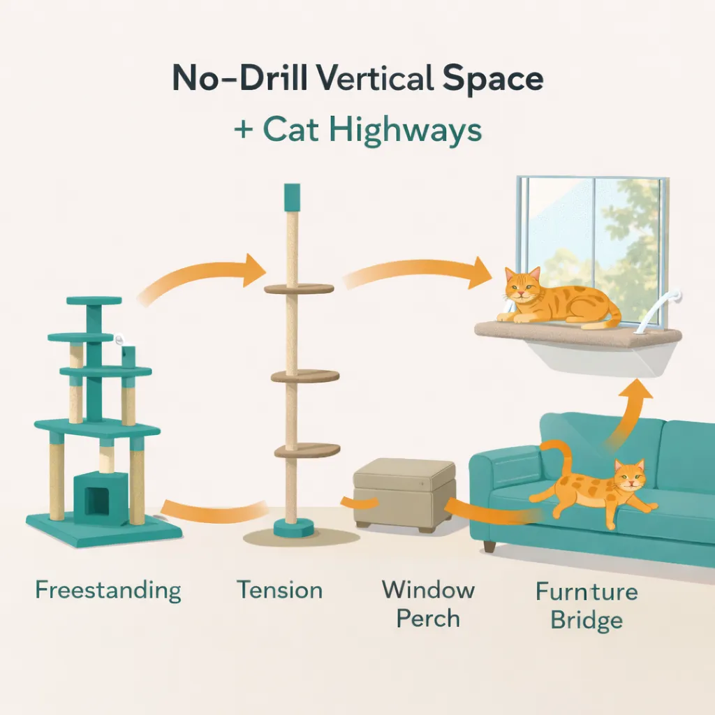 No-Drill Vertical Space: trees, tension systems, window perches + “bridges”